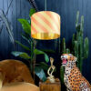 Step right up, ladies and gents, and behold the mesmerising Helter Skelter Velvet Gold Lined Lampshades – a true spectacle for your living space! With our in-house designed fabric featuring a playful Diagonal striped pattern reminiscent of the whimsical fairground favourite, these lampshades bring a touch of circus-style flair and fun into your home. The luxurious gold foil lining adds a touch of opulence while casting a warm, inviting glow. Choose from our range of eight sizes to find the perfect fit for any room. Elevate your decor with a dash of excitement – it’s time to light up your space with Helter Skelter!