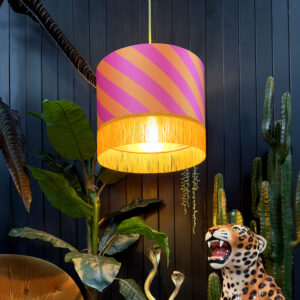 Introducing the Helter Skelter Tutti Frutti Lampshades – where colour explodes and fun never fades. Handmade with love, these drum lampshades in Pumpkin and Petal diagonal stripes will transform any room into a vibrant circus of light and joy. Let the playful design whisk you away to a world of spectacle and extravagance right in your own home!