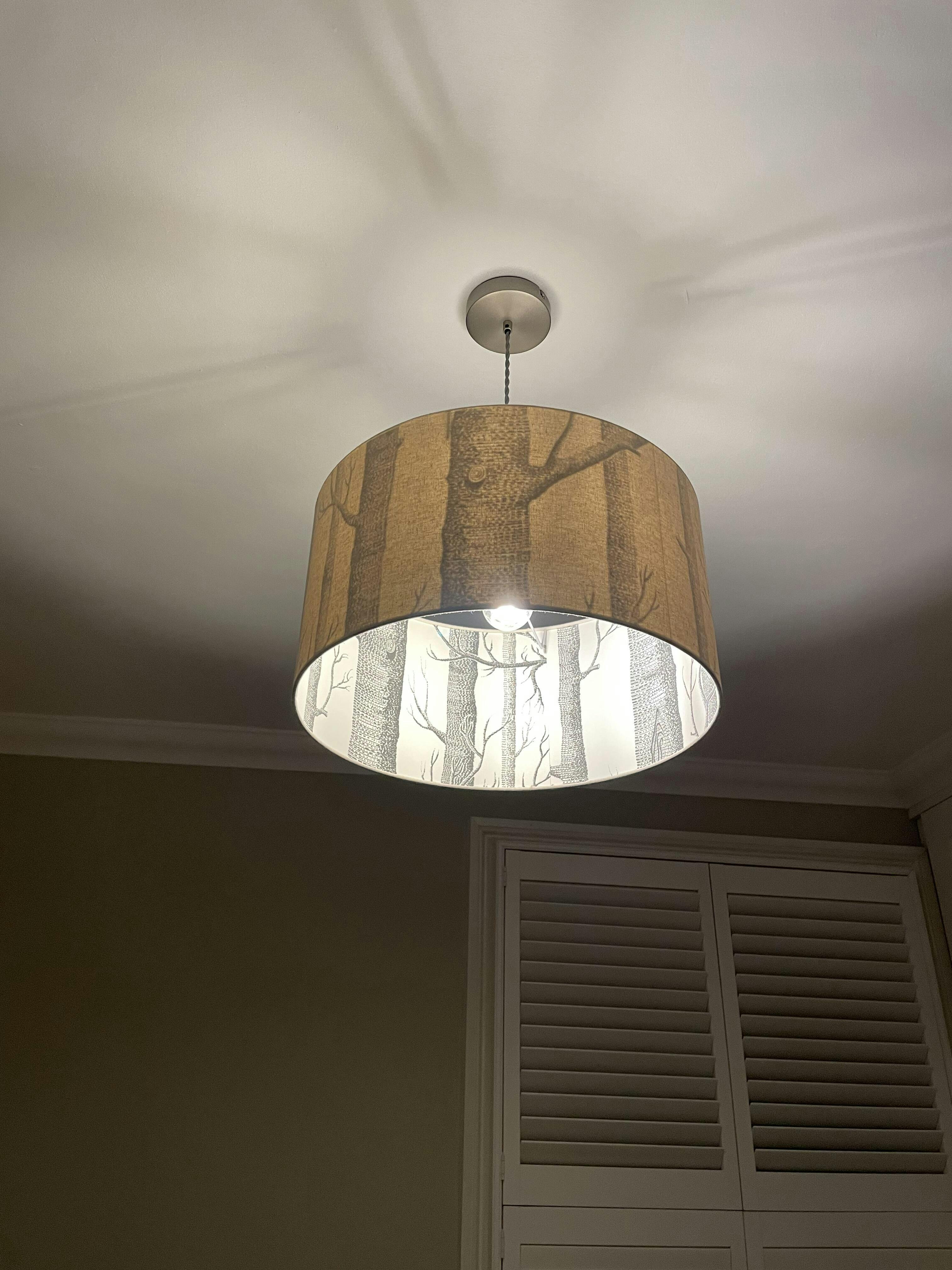 Cole & Sons The Woods wallpaper paired with our soft oatmeal linen. Allowing the print on the inside of the shade to appear once the light is illuminated.