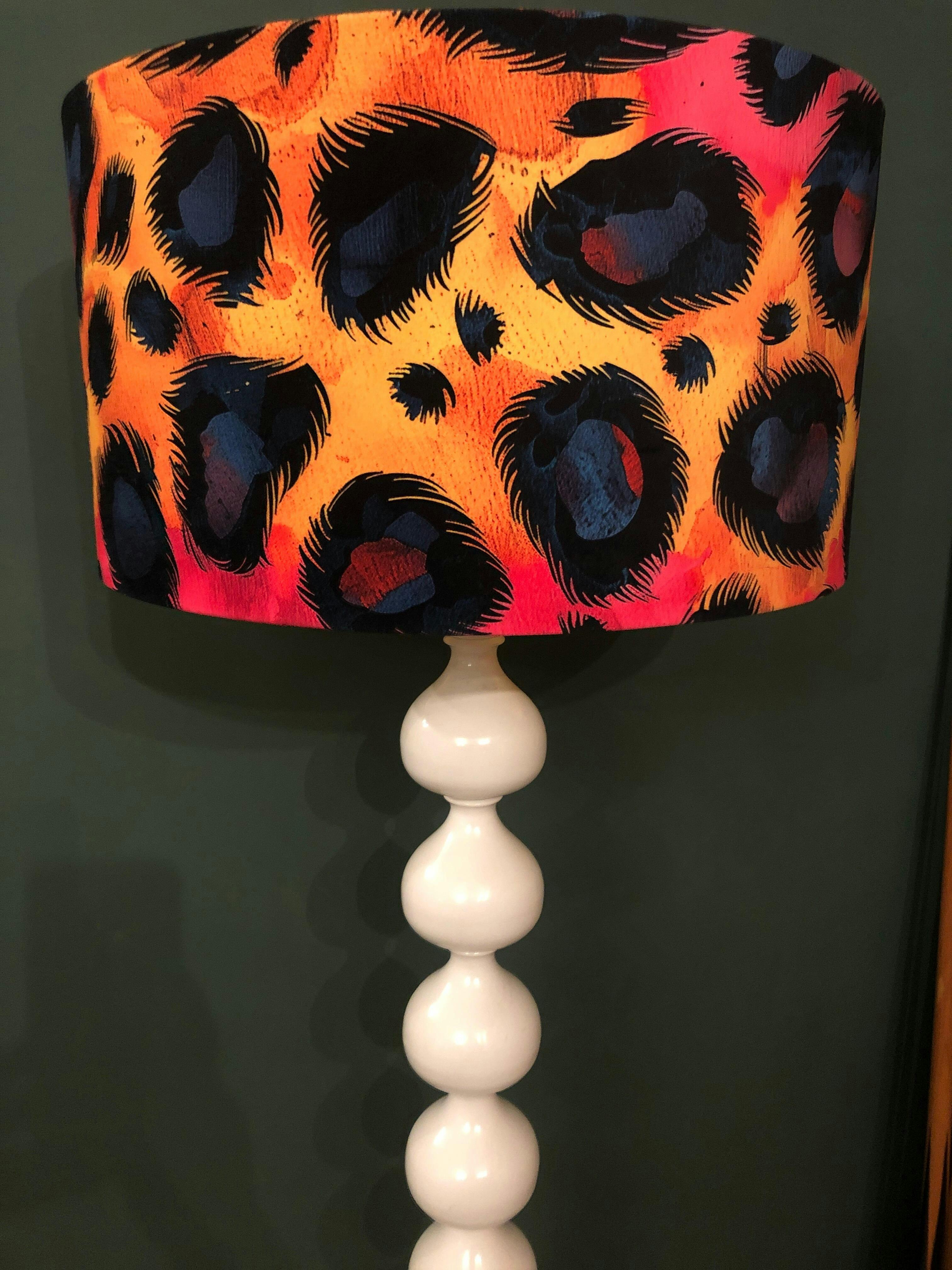 Unleash your wild side with our Electric Leopard Velvet Drum Lampshades, a fearless fusion of maximalist design and electric colour. Bursting with bold magenta, blue, and fiery yellow tones, this isn’t your average animal print—this is leopard print turned ALL the way up.
