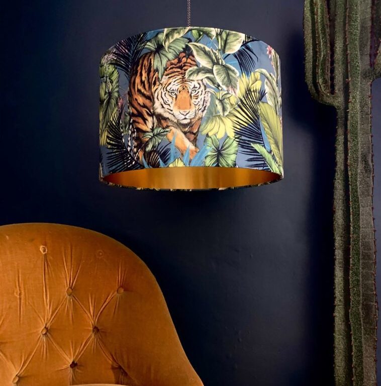 Big Cat Velvet Lampshade With Gold Lining In Flint Blue